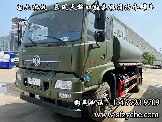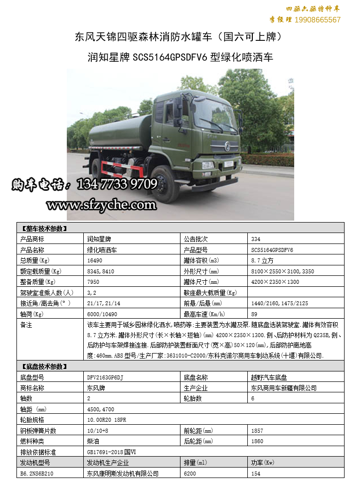 東風(fēng)天錦四驅(qū)森林消防灑水車_國六排放潤知星牌SCS5164GPSDFV6型四驅(qū)越野綠化噴灑車采用DFV2163GP6DJ型國六排放東風(fēng)天錦四驅(qū)越野底盤,東風(fēng)天錦D530一排半駕駛室,4×4驅(qū)動(dòng),康明斯B6.2NS6B210國六發(fā)動(dòng)機(jī)210馬力,最大扭矩850N.m/1100-1700rpm,排量6.2L、韶齒手動(dòng)六檔變速箱,東風(fēng)德納車橋,前驅(qū)動(dòng)橋4.5噸,后橋10噸,10.00R20輪胎,軸距4500mm/4700mm,電動(dòng)玻璃,方向助力,斷氣剎,ABS,大燈自動(dòng)調(diào)節(jié),自動(dòng)調(diào)整臂,選裝原廠空調(diào)。罐體采用優(yōu)質(zhì)碳鋼Q235板材,板材厚度4mm,罐體容積8.7立方,安裝夾心取力器,后置泵箱,消防栓接口左右各一個(gè),消防炮采用PS30-50D消防水炮,流量40L/S/1.0MPa 水射程:≥50m,消防泵采用常壓消防泵型號(hào):CB10/40車用消防泵,流量:40L/s,壓力:1.0MPa,駕駛室頂部安裝長條警燈帶喊話器,兩側(cè)噴涂白色森林消防字樣。