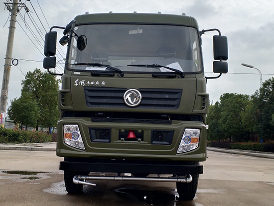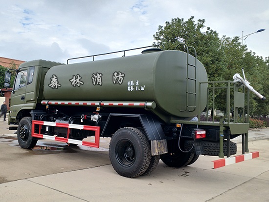 采用東風(fēng)EQ2180GD5DJ型越野汽車底盤,東風(fēng)一排半寬體駕駛室,4×4驅(qū)動(dòng),康明斯ISB190 50國五發(fā)動(dòng)機(jī),六檔變速箱,東風(fēng)商用車橋,前驅(qū)動(dòng)橋3.8噸,后橋10噸,10.00R20輪胎,軸距4500mm,電動(dòng)玻璃,方向助力,斷氣剎,ABS。罐體采用優(yōu)質(zhì)碳鋼QB235板材,板材厚度4mm,罐體容積11.1立方,變速箱安裝取力器,大功率水泵可泵進(jìn)泵出,后置工作平臺(tái)帶水炮射程25米,消防栓接口左右各一個(gè),選裝駕駛室頂部安裝長條警燈帶喊話器,全車顏色軍綠,兩側(cè)噴涂白色森林消防字樣。