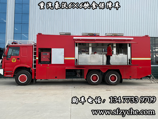 重汽豪沃6×6消防飲食保障車是根據(jù)公安,武警,消防,林業(yè)局,地質(zhì)勘探,水利水電,公路搶險(xiǎn)等部門野外執(zhí)行任務(wù)的需要,為提高后勤保障能力,改善野外生存條件而研制的一種新型野外自行式炊事車,特別適應(yīng)快速反應(yīng)部隊(duì)執(zhí)行任務(wù)的需要。該車采用重汽豪沃六驅(qū)底盤,車廂為隔熱保溫大板粘接式輕型結(jié)構(gòu),多種供電方式為車內(nèi)各用電設(shè)備提供電源。車內(nèi)配有高效的封閉式燃油節(jié)能爐灶、配套設(shè)備、各種廚具等。本車具有操作方便、使用可靠、熱效率高,保溫效果好等特點(diǎn),適應(yīng)全天候展收作業(yè),是先進(jìn)的后勤裝備?稍谝恍r內(nèi)供應(yīng)150人的主副食及開水。備注:據(jù)用戶需求,整車對底盤進(jìn)行改裝,設(shè)有8-13Kw駐車自發(fā)電系統(tǒng),1.5Kw行車發(fā)電系統(tǒng),以及配電系統(tǒng),主副食控制系統(tǒng),作業(yè)監(jiān)控系統(tǒng),水路系統(tǒng),油路系統(tǒng), 附件及工具。