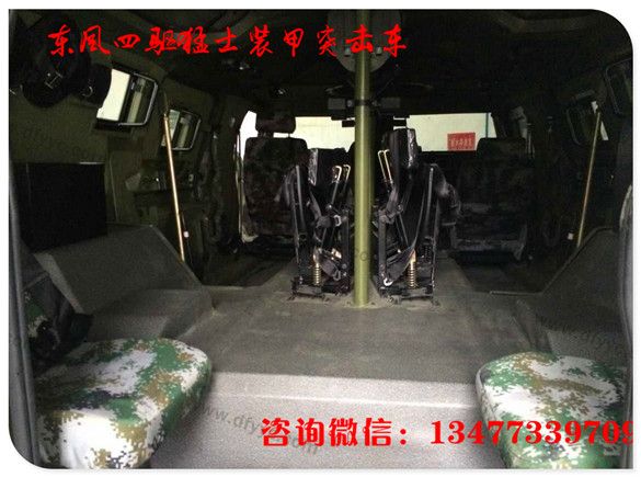 猛士裝甲內(nèi)飾:同樣受保密制度限制,沒有第一時間得到猛士裝甲版內(nèi)飾照片,與猛士基礎(chǔ)車型相仿,因?yàn)橹兄靡妫噧?nèi)中央通道前部被發(fā)動機(jī)所占據(jù),后排座的中央通道形成一個平臺,可放置貨品或?yàn)檐図斘淦骰咎峁┤藛T操作平臺。請注意上下兩幅圖的猛士裝甲版車門內(nèi)側(cè)特寫的不同。