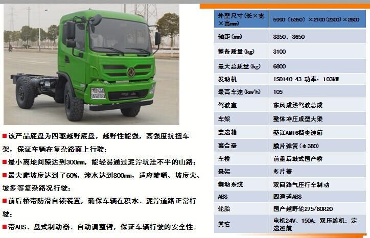 EQ2070GZ4DJ越野四驅(qū)底盤的詳細(xì)描述:該產(chǎn)品底盤為四驅(qū)越野底盤,越野性能強(qiáng),高強(qiáng)度抗扭車架,保證車輛在復(fù)雜路面上行駛時,不會出現(xiàn)大梁斷裂等情況;最小離地間隙達(dá)到300mm,能輕易通過泥濘坑洼不平的山路;最大爬坡度達(dá)到了60%,適應(yīng)陡峭、坡度大、坡多等復(fù)雜路況行駛。前后橋帶防滑自鎖裝置,確保車輛在積水、泥濘道路正常行駛;帶ABS、盤式制動器、自動調(diào)整臂,保證車輛行駛的安全性。