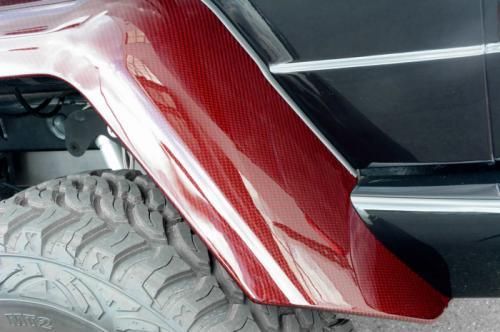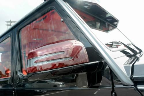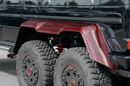 第一眼看去,這輛G63 AMG 6x6的涂裝會讓人感覺有些怪異。的確,這輛Brabus出品的六輪怪獸換上了紅色碳纖維車身改裝件,后視鏡蓋、輪眉以及引擎蓋都采用了紅色碳纖維材料。透過車窗我們能看到內飾同樣是紅色主題,甚至是輪圈內也有紅色點綴。